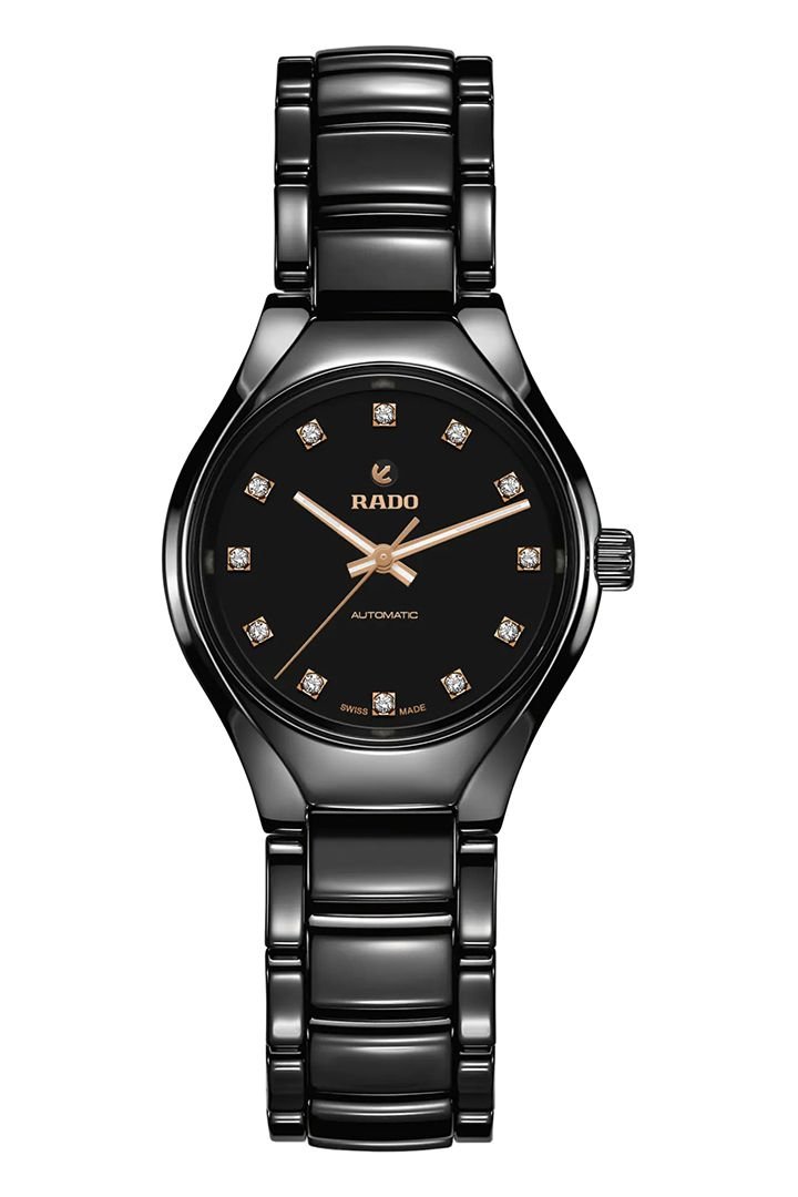 luxusné hodinky Rado True Automat, Diamanty, 30mm. Hodinky disponujú funkciami luminiscencia. Základné parametre hodín sú: vode odolnosť je 30 m, farba ciferníka je čierna, materiál remienka je keramika a typ strojčeka je mechanické hodinky s automatickým náťahom.