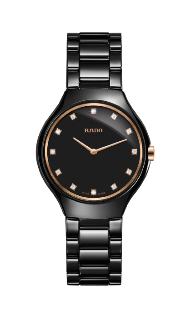 Luxusné hodinky Rado True Thinline, Quartz, 30 mm. Základné parametre hodín sú: farba ciferníka je čierna, typ strojčeka je Quartz hodinky, vode odolnosť je 30 m a materiál remienka je keramika.