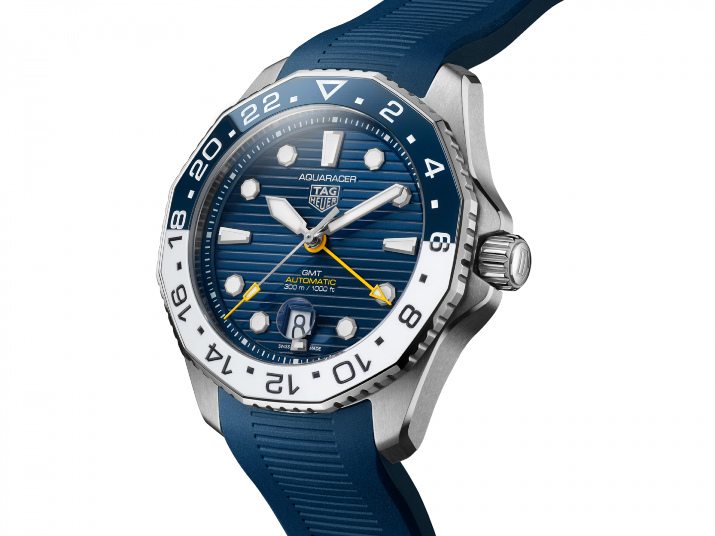 luxusné hodinky TAG Heuer Aquaracer PROFESSIONAL 300 GMT Automat, Vode odolnosť 300M, 43 mm. Hodinky disponujú funkciami luminiscencia, ukazovateľ dátumu a duálny čas. Základné parametre hodín sú: typ strojčeka je mechanické hodinky s automatickým náťahom, vode odolnosť je 300 m, farba ciferníka je modrá a materiál remienka je kaučuk.