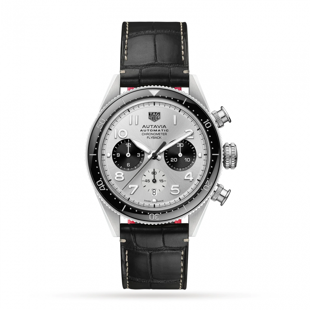 luxusné hodinky TAG Heuer Autavia Chronometer Flyback Heuer 02, 42 mm. Hodinky disponujú funkciami stopky, ukazovateľ dátumu a luminiscencia. Základné parametre hodín sú: farba ciferníka je čierna a strieborná, typ strojčeka je mechanický chronograf s automatickým náťahom, vode odolnosť je 100 m a materiál remienka je koža.