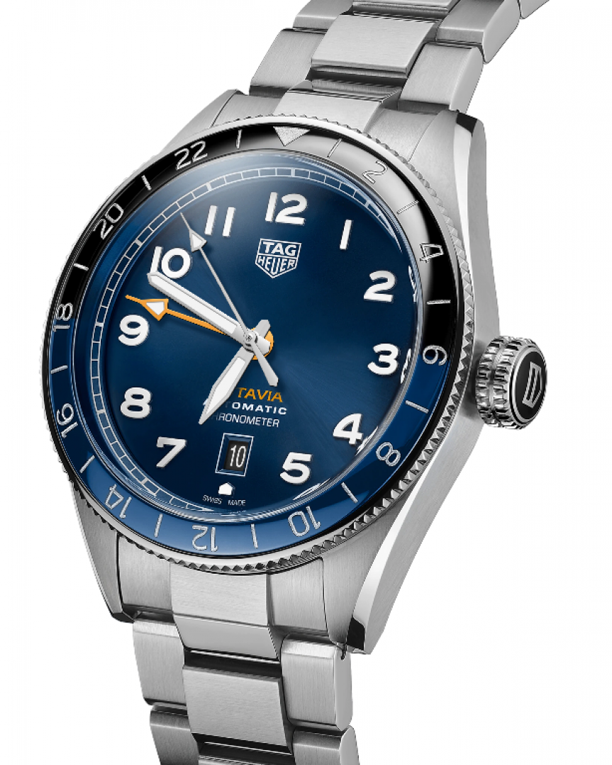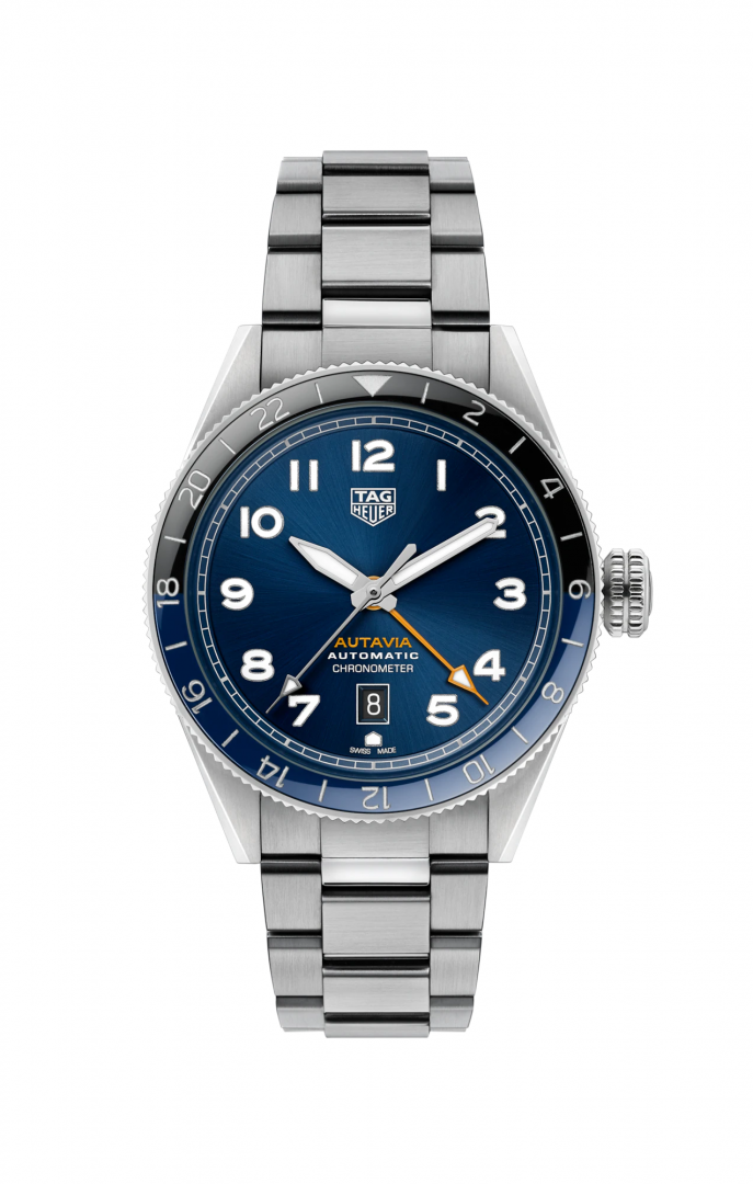 luxusné hodinky TAG Heuer Autavia Calibre 7, COSC GMT, 42 mm. Hodinky disponujú funkciami luminiscencia, ukazovateľ dátumu a duálny čas. Základné parametre hodín sú: typ strojčeka je mechanické hodinky s automatickým náťahom, vode odolnosť je 100 m, materiál remienka je oceľ a farba ciferníka je modrá.