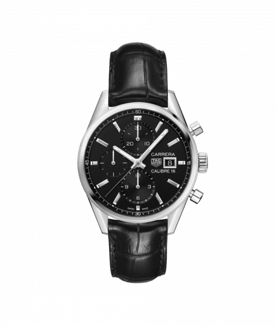 luxusné hodinky TAG Heuer Carrera Calibre 16, Vode odolnosť 100M, 41 mm. Hodinky disponujú funkciami luminiscencia, stopky a ukazovateľ dátumu. Základné parametre hodín sú: typ strojčeka je mechanický chronograf s automatickým náťahom, vode odolnosť je 100 m, materiál remienka je koža a farba ciferníka je čierna.