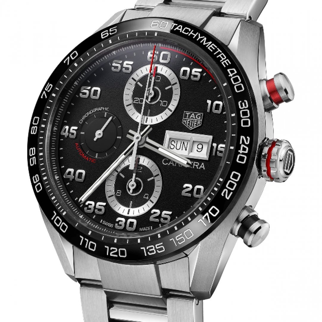 luxusné hodinky TAG Heuer Carrera Automat Chronograf, Vode odolnosť 100M, 44 mm. Hodinky disponujú funkciami luminiscencia, stopky, tachymeter a ukazovateľ dátumu. Základné parametre hodín sú: farba ciferníka je čierna, typ strojčeka je mechanický chronograf s automatickým náťahom, materiál remienka je oceľ a vode odolnosť je 100 m.