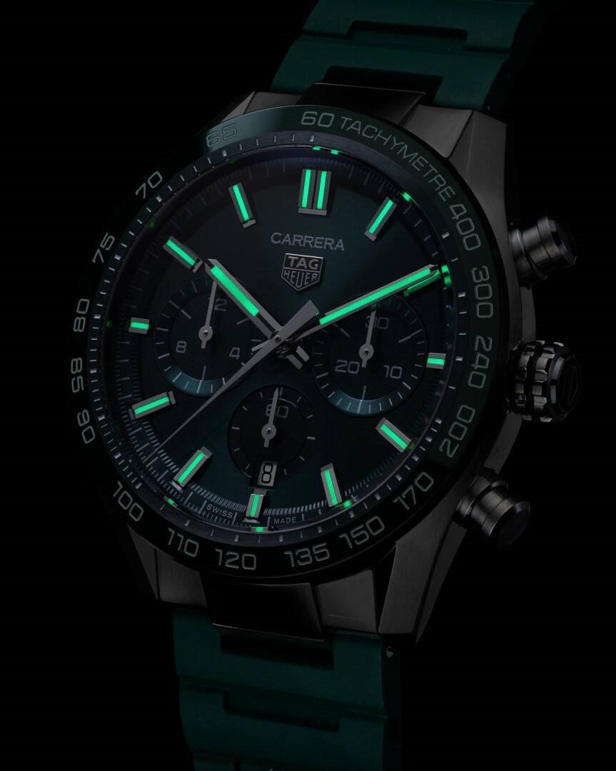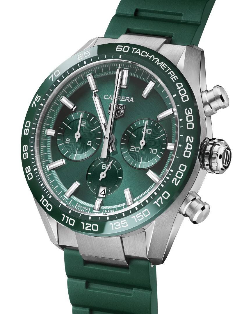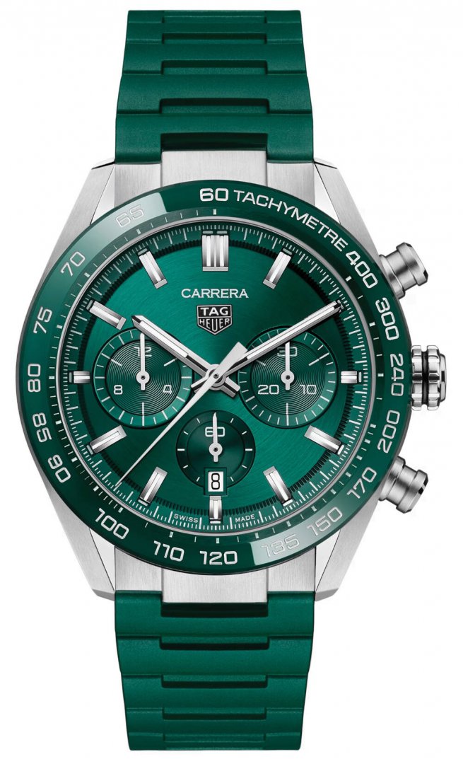 luxusné hodinky TAG Heuer Carrera HEUER 02, Vode odolnosť 100M, 44 mm. Hodinky disponujú funkciami luminiscencia, stopky, tachymeter a ukazovateľ dátumu. Základné parametre hodín sú: typ strojčeka je mechanický chronograf s automatickým náťahom, vode odolnosť je 100 m, farba ciferníka je zelená a materiál remienka je kaučuk.