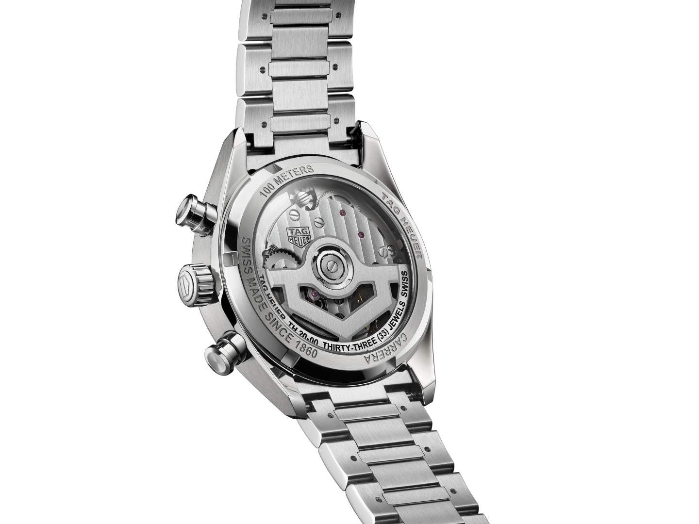 luxusné hodinky TAG Heuer Carrera TH 20-00, Vode odolnosť 100m, 39 mm. Hodinky disponujú funkciami stopky a ukazovateľ dátumu. Základné parametre hodín sú: farba ciferníka je strieborná, typ strojčeka je mechanický chronograf s automatickým náťahom, materiál remienka je oceľ a vode odolnosť je 100 m.