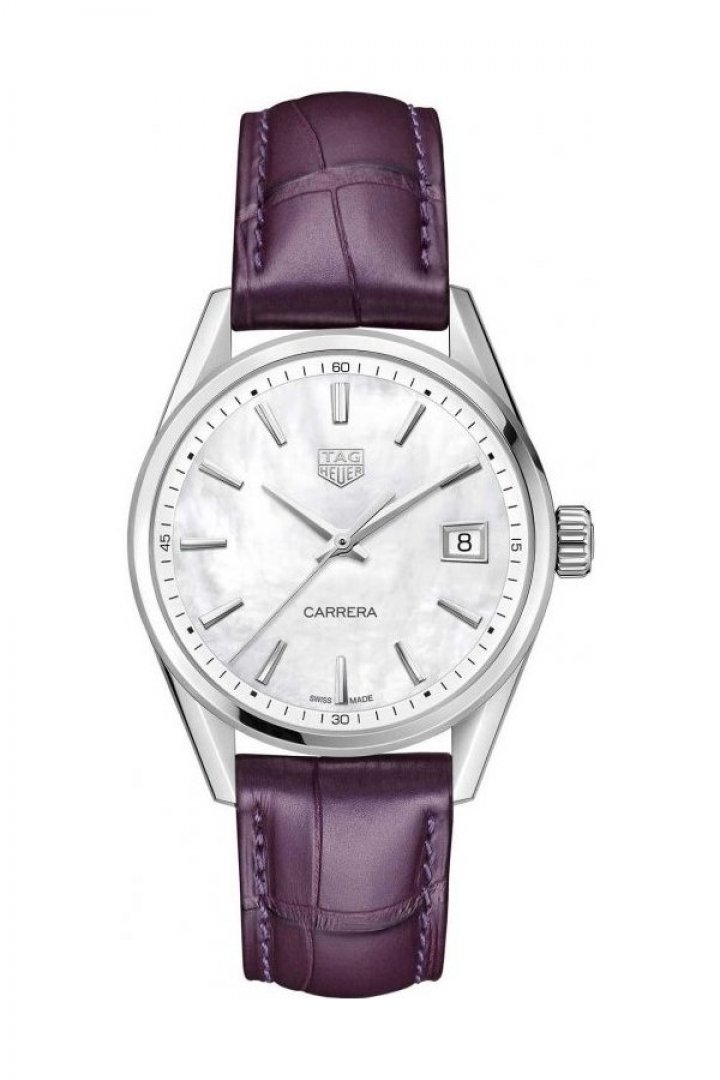 Luxusné hodinky TAG Heuer Carrera Quartz, 36 mm. Hodinky disponujú funkciami ukazovateľ dátumu a E.O.L.. Základné parametre hodín sú: typ strojčeka je Quartz hodinky, vode odolnosť je 100 m, materiál remienka je koža a farba ciferníka je perleť.