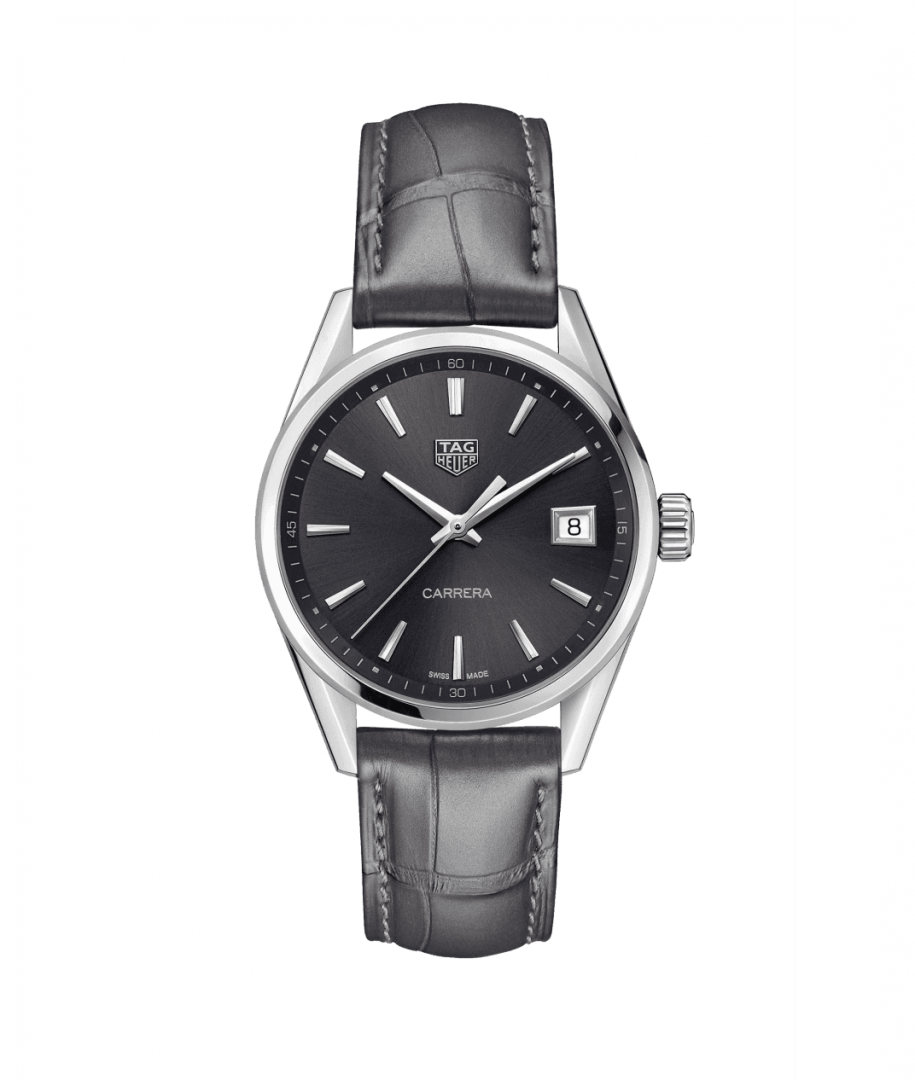 Luxusné hodinky TAG Heuer Carrera Quartz, 36 mm. Hodinky disponujú funkciami ukazovateľ dátumu a E.O.L.. Základné parametre hodín sú: typ strojčeka je Quartz hodinky, vode odolnosť je 100 m, materiál remienka je koža a farba ciferníka je šedá.