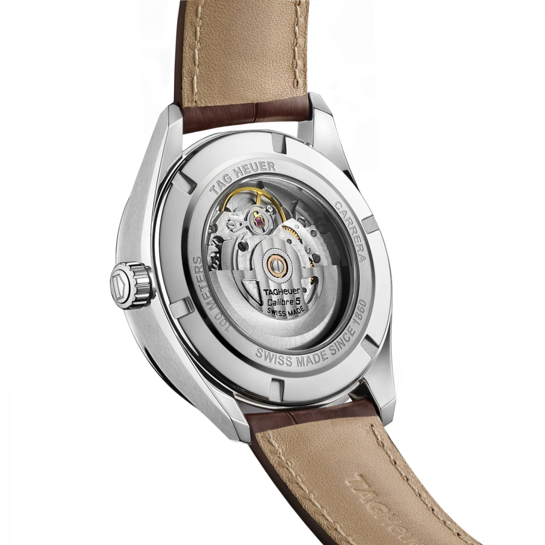 luxusné hodinky TAG Heuer Carrera Calibre 5, Vode odolnosť 100M, 41 mm. Hodinky disponujú funkciami luminiscencia a ukazovateľ dátumu. Základné parametre hodín sú: typ strojčeka je mechanické hodinky s automatickým náťahom, vode odolnosť je 100 m, farba ciferníka je strieborná a materiál remienka je koža.