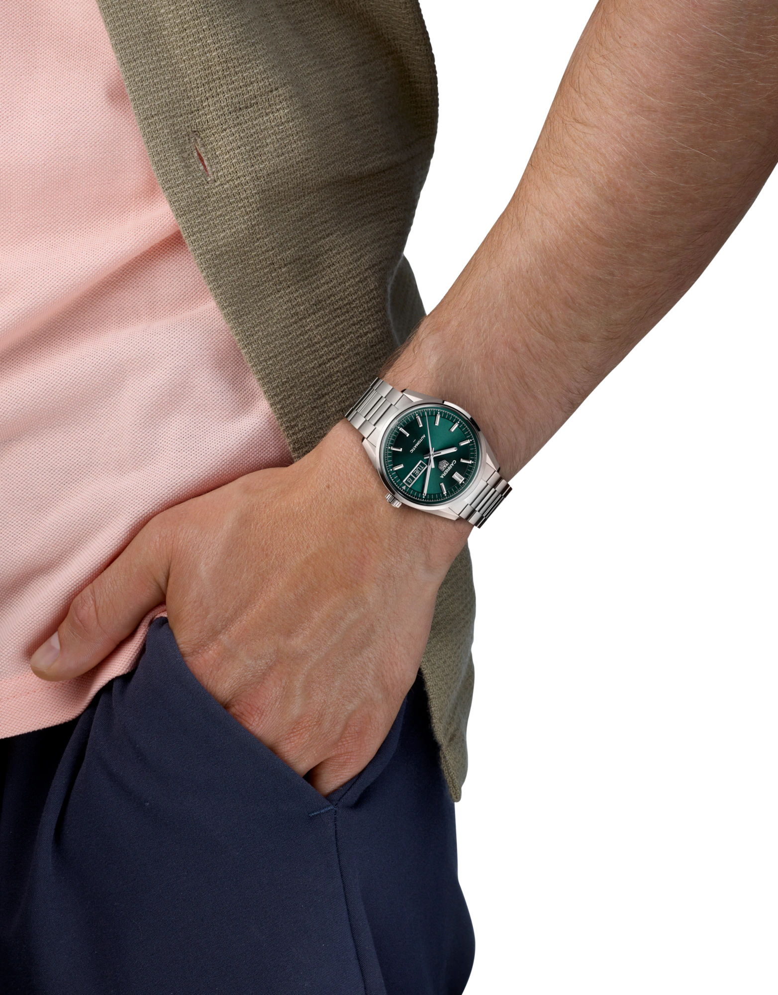 • Ciferník: Tmavozelený s povrchovou úpravou sunray a okienkom s dňom a dátumom na pozícii 3 hodiny.