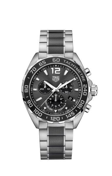 Luxusné hodinky TAG Heuer Formula 1 Keramický náramok, Quartz Chronograf, 43 mm. Hodinky disponujú funkciami stopky, tachymeter a ukazovateľ dátumu. Základné parametre hodín sú: farba ciferníka je šedá, typ strojčeka je Quartz chronograf, materiál remienka je keramika a oceľ a vode odolnosť je 200 m.