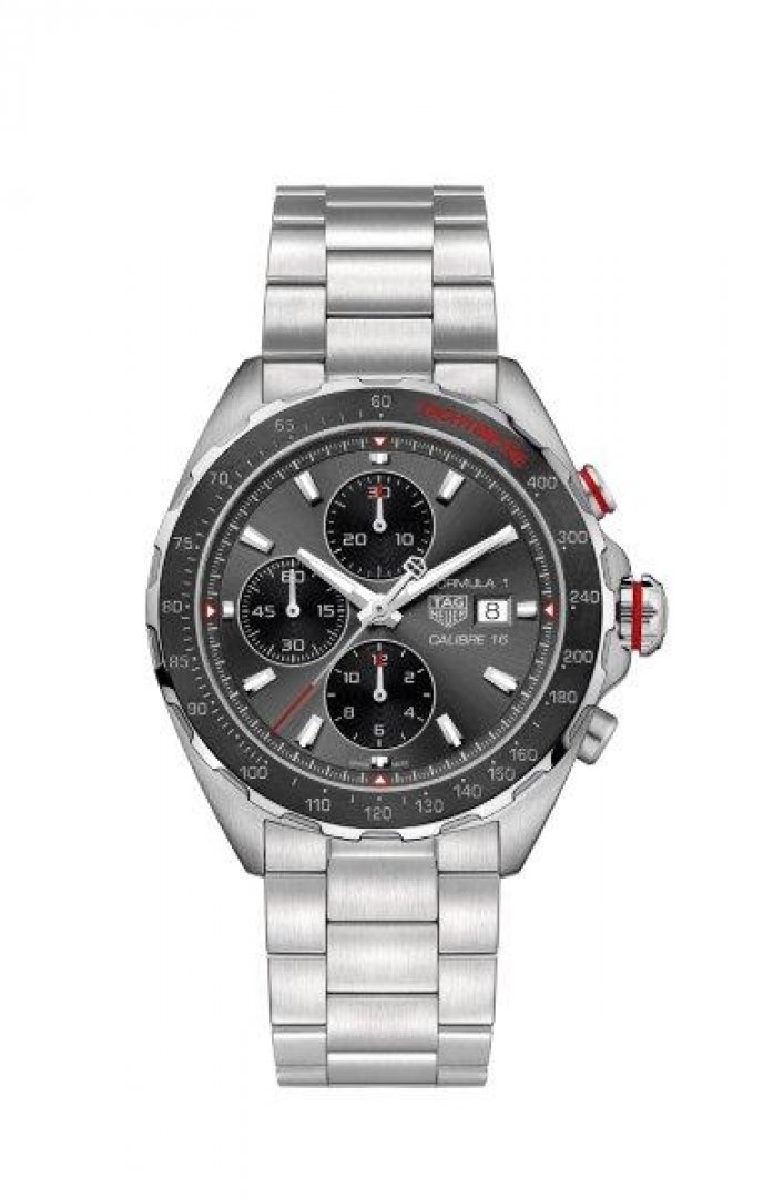 Luxusné hodinky TAG Heuer Formula 1 Caliber 16, Automat Chronograf, 44 mm. Hodinky disponujú funkciami stopky, tachymeter a ukazovateľ dátumu. Základné parametre hodín sú: typ strojčeka je mechanický chronograf s automatickým náťahom, vode odolnosť je 200 m, farba ciferníka je šedá a materiál remienka je oceľ.