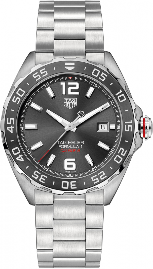 luxusné hodinky TAG Heuer Formula 1 Automat, Vode odolnosť 200M, 43 mm. Hodinky disponujú funkciami luminiscencia a ukazovateľ dátumu. Základné parametre hodín sú: farba ciferníka je šedá, typ strojčeka je mechanické hodinky s automatickým náťahom, materiál remienka je oceľ a vode odolnosť je 200 m.