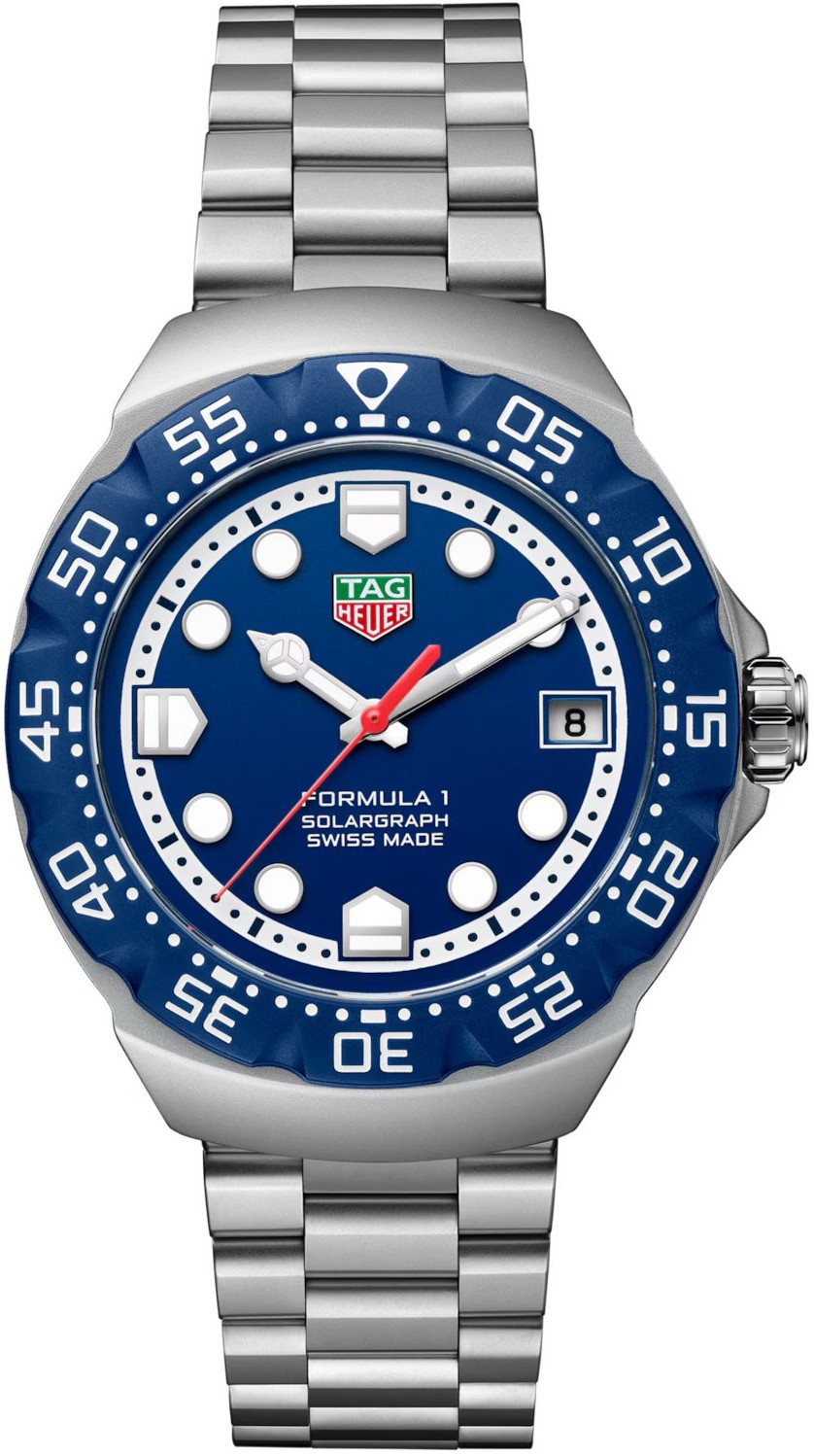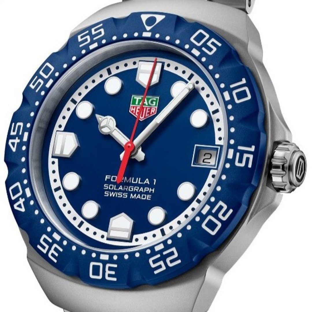 luxusné hodinky TAG Heuer Formula 1 Solargraph Vode odolnosť 100M, Quartz, 38 mm. Hodinky disponujú funkciami luminiscencia a ukazovateľ dátumu. Základné parametre hodín sú: typ strojčeka je Quartz hodinky, materiál remienka je oceľ, farba ciferníka je biela a modrá a vode odolnosť je 100 m.
