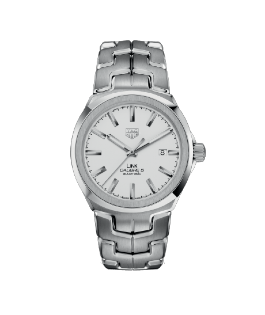 Luxusné hodinky TAG Heuer Link Calibre 5 Vode odolnosť 100M, 41 mm. Hodinky disponujú funkciami ukazovateľ dátumu. Základné parametre hodín sú: typ strojčeka je mechanické hodinky s automatickým nátahem, materiál remienka je oceľ, vode odolnosť je 100 m a farba ciferníka je strieborná.