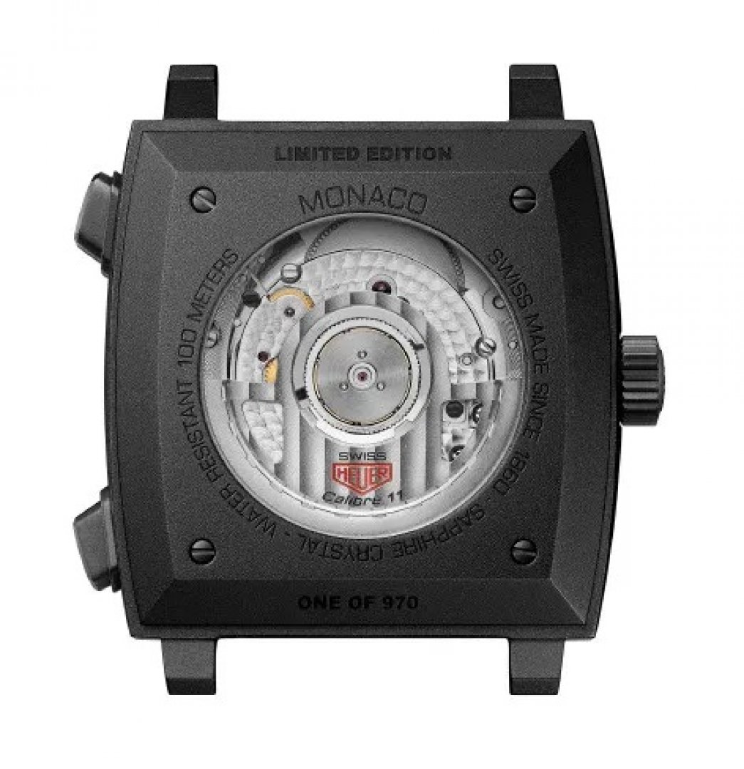 luxusné hodinky TAG Heuer Monaco Calibre 11, Vode odolnosť 100M, 39 mm. Hodinky disponujú funkciami luminiscencia, stopky a ukazovateľ dátumu. Základné parametre hodín sú: typ strojčeka je mechanický chronograf s automatickým náťahom, vode odolnosť je 100 m, farba ciferníka je biela a čierna a materiál remienka je koža.