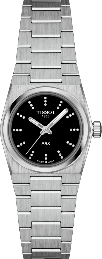 luxusné hodinky Tissot PRX Diamanty, Quartz, Vode odolnosť 100M, 25 mm. Hodinky disponujú funkciami ukazovateľ dátumu. Základné parametre hodín sú: typ strojčeka je Quartz hodinky, vode odolnosť je 100 m, materiál remienka je oceľ a farba ciferníka je čierna.