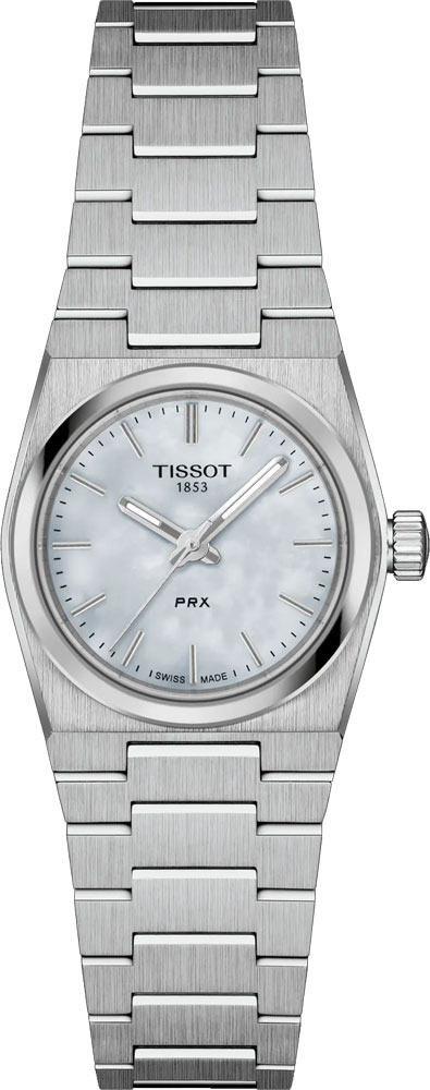 luxusné hodinky Tissot PRX Quartz, Vode odolnosť 100M, 25 mm. Hodinky disponujú funkciami ukazovateľ dátumu. Základné parametre hodín sú: typ strojčeka je Quartz hodinky, vode odolnosť je 100 m, materiál remienka je oceľ a farba ciferníka je perleť.