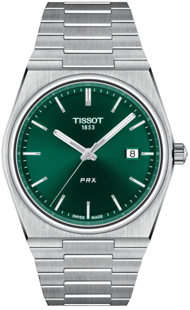 športové hodinky Tissot PRX Quartz, Vode odolnosť 100M, 40 mm. Hodinky disponujú funkciami ukazovateľ dátumu. Základné parametre hodín sú: typ strojčeka je Quartz hodinky, materiál remienka je oceľ, vode odolnosť je 100 m a farba ciferníka je zelená.