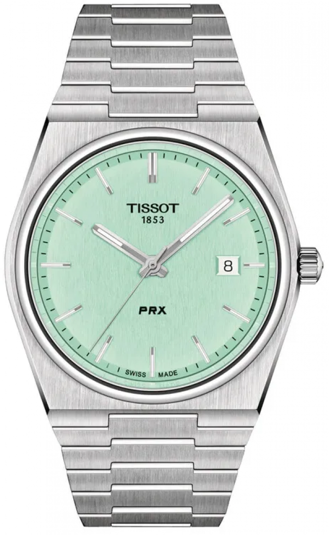 športové hodinky Tissot PRX Quartz, Vode odolnosť 100M, 40 mm. Hodinky disponujú funkciami ukazovateľ dátumu. Základné parametre hodín sú: typ strojčeka je Quartz hodinky, materiál remienka je oceľ, vode odolnosť je 100 m a farba ciferníka je zelená.
