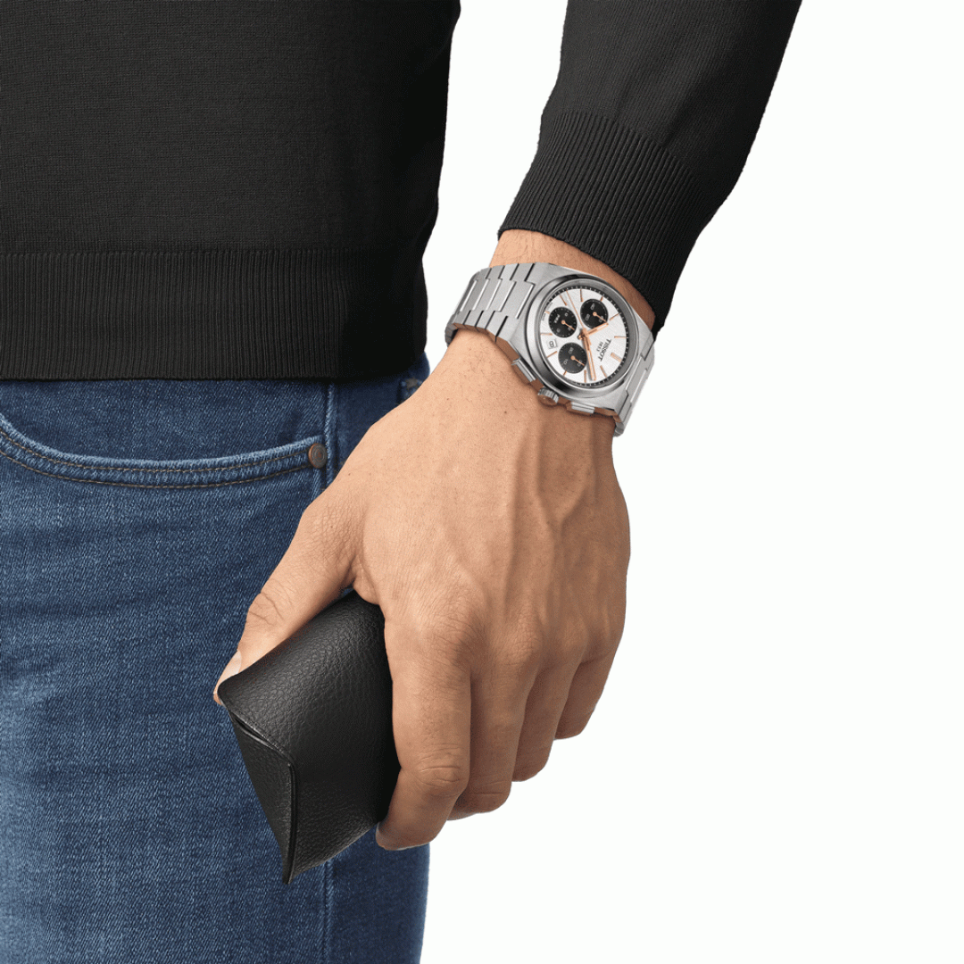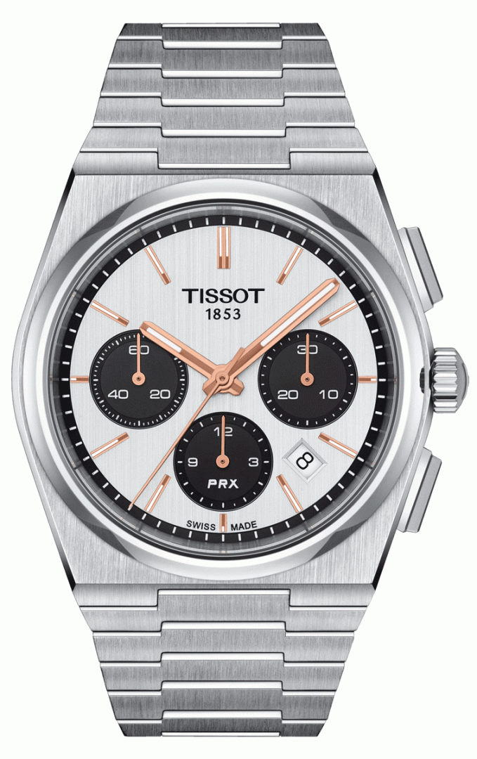 luxusné hodinky Tissot PRX Chronograph Automat Chronograf, Vode odolnosť 100M, 41.5 mm. Hodinky disponujú funkciami luminiscencia, stopky a ukazovateľ dátumu. Základné parametre hodín sú: farba ciferníka je čierna a strieborná, typ strojčeka je mechanický chronograf s automatickým náťahom, materiál remienka je oceľ a vode odolnosť je 100 m.