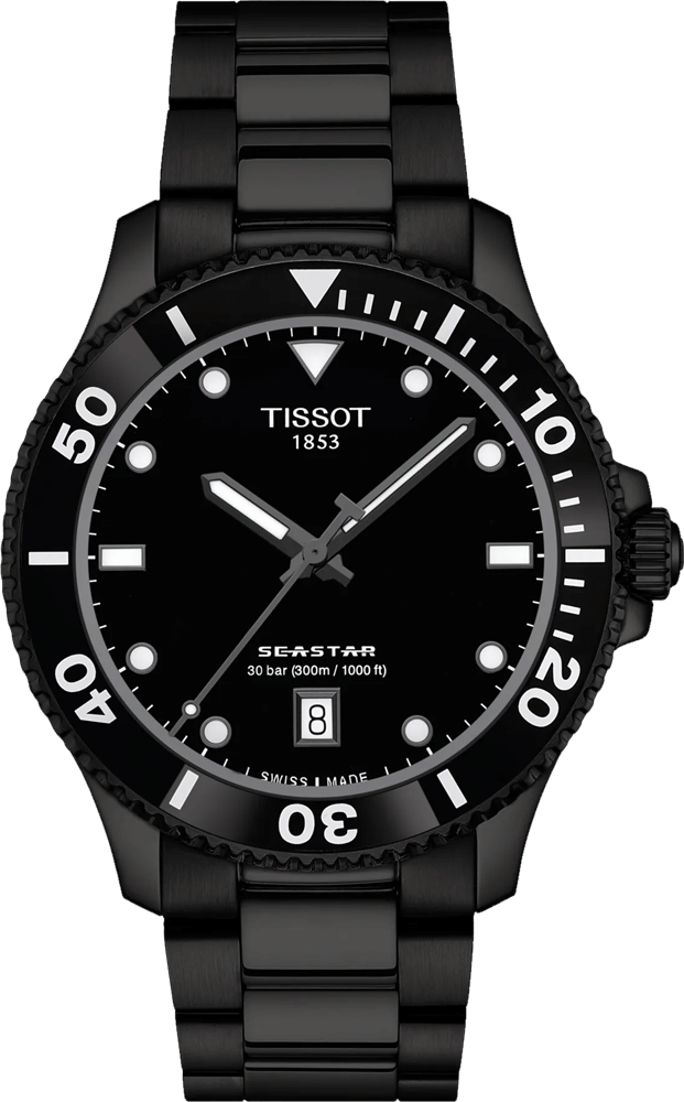 luxusné hodinky Tissot Seastar 1000 PROFESSIONAL Quartz, Vode odolnosť 300M, 40 mm. Hodinky disponujú funkciami luminiscencia, ukazovateľ dátumu a E.O.L.. Základné parametre hodín sú: typ strojčeka je Quartz hodinky, vode odolnosť je 300 m, farba ciferníka je čierna a materiál remienka je oceľ.