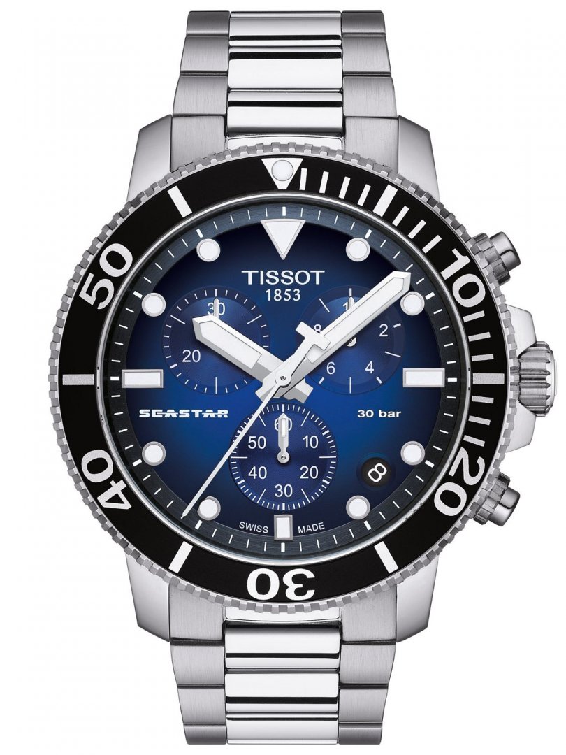 luxusné hodinky Tissot Seastar 1000 PROFESSIONAL Quartz Chronograf, Vode odolnosť 300M, 45.50 mm. Hodinky disponujú funkciami luminiscencia, stopky, ukazovateľ dátumu a E.O.L.. Základné parametre hodín sú: farba ciferníka je čierna a modrá, typ strojčeka je Quartz chronograf, vode odolnosť je 300 m a materiál remienka je oceľ.