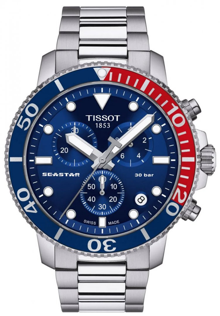 luxusné hodinky Tissot Seastar 1000 PROFESSIONAL Quartz Chronograf, Vode odolnosť 300M, 45.50 mm. Hodinky disponujú funkciami luminiscencia, ukazovateľ dátumu, stopky a E.O.L.. Základné parametre hodín sú: materiál remienka je oceľ, vode odolnosť je 300 m, farba ciferníka je modrá a typ strojčeka je Quartz chronograf.
