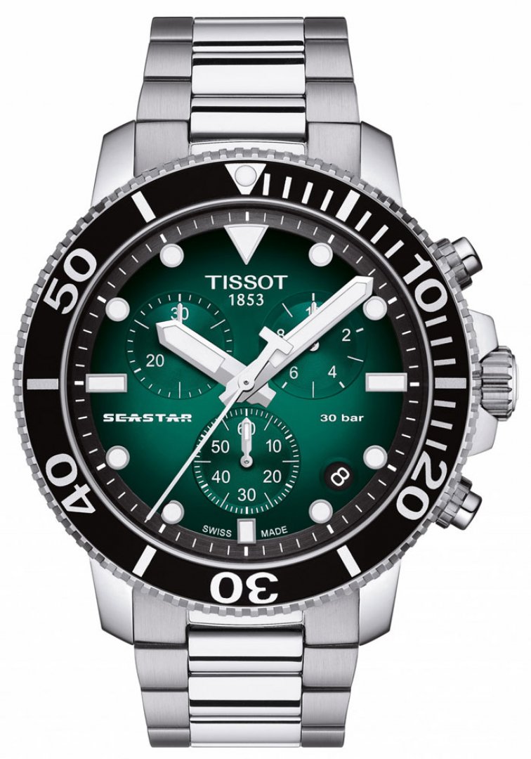 luxusné hodinky Tissot Seastar 1000 PROFESSIONAL Quartz Chronograf, Vode odolnosť 300M, 45.50 mm. Hodinky disponujú funkciami luminiscencia, stopky, ukazovateľ dátumu a E.O.L.. Základné parametre hodín sú: typ strojčeka je Quartz chronograf, vode odolnosť je 300 m, materiál remienka je oceľ a farba ciferníka je zelená.