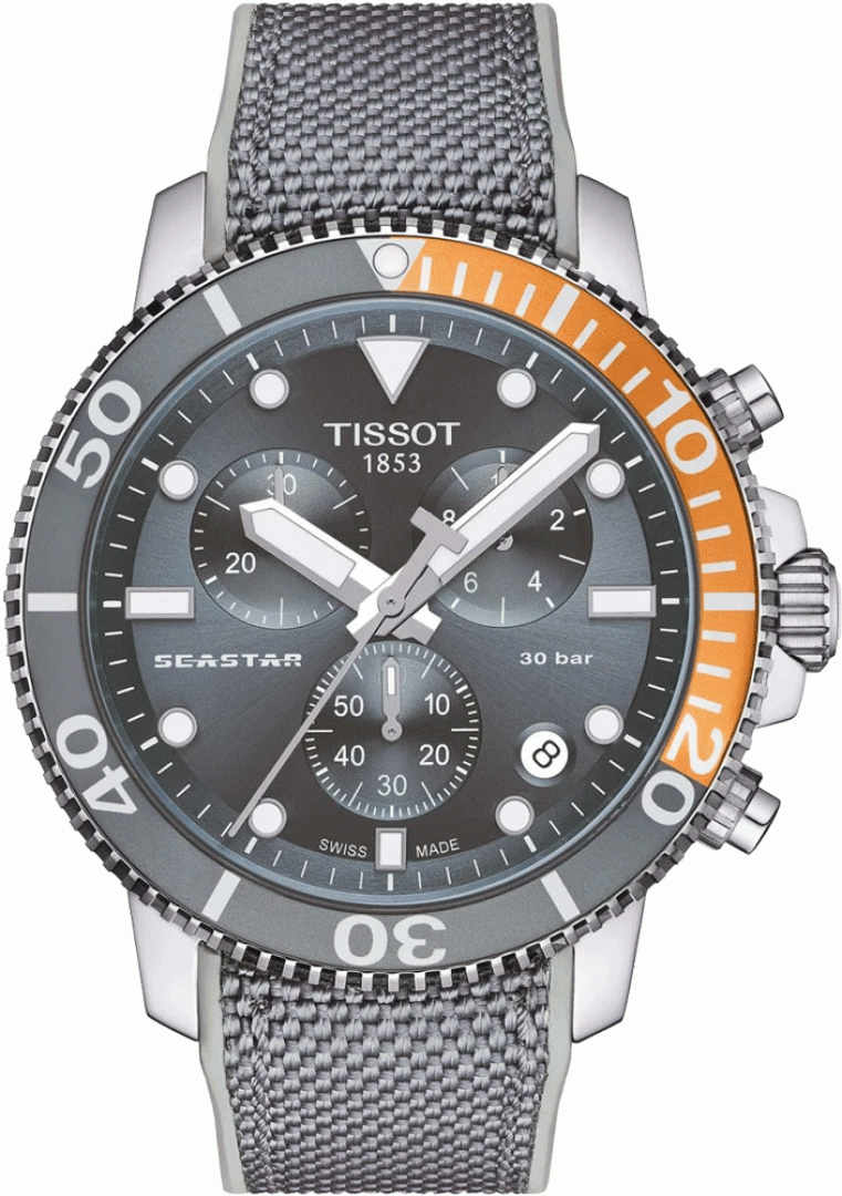 luxusné hodinky Tissot Seastar 1000 PROFESSIONAL Vode odolnosť 300M, Quartz, 45.50 mm. Hodinky disponujú funkciami luminiscencia, stopky, ukazovateľ dátumu a E.O.L.. Základné parametre hodín sú: typ strojčeka je Quartz chronograf, materiál remienka je kaučuk, vode odolnosť je 300 m a farba ciferníka je šedá.