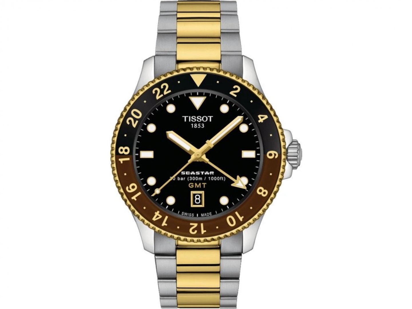 luxusné hodinky Tissot Seastar 1000 QUARTZ GMT Quartz, Vode odolnosť 300M, 40 mm. Hodinky disponujú funkciami luminiscencia, ukazovateľ dátumu, E.O.L. a duálny čas. Základné parametre hodín sú: typ strojčeka je Quartz hodinky, vode odolnosť je 300 m, farba ciferníka je čierna a materiál remienka je oceľ.