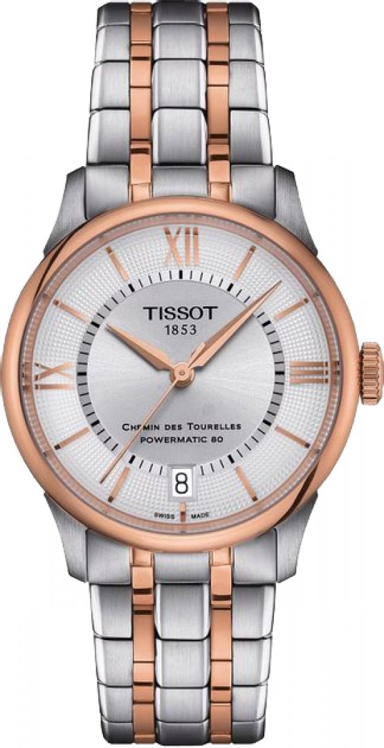 luxusné hodinky Tissot T-Classic CHEMIN DES Tourelles Powermatic 80, Automat, 34 mm. Hodinky disponujú funkciami ukazovateľ dátumu. Základné parametre hodín sú: typ strojčeka je mechanické hodinky s automatickým náťahom, materiál remienka je oceľ, vode odolnosť je 50 m a farba ciferníka je strieborná.