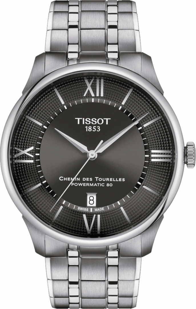 luxusné hodinky Tissot T-Classic Chemin des Tourelles Powermatic 80, 42 mm. Hodinky disponujú funkciami ukazovateľ dátumu. Základné parametre hodín sú: typ strojčeka je mechanické hodinky s automatickým náťahom, materiál remienka je oceľ, vode odolnosť je 50 m a farba ciferníka je čierna.