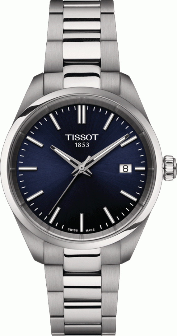luxusné hodinky Tissot T-Classic PR 100 Quartz, Vode odolnosť 100M, 34 mm. Hodinky disponujú funkciami luminiscencia, ukazovateľ dátumu a E.O.L.. Základné parametre hodín sú: typ strojčeka je Quartz hodinky, materiál remienka je oceľ, vode odolnosť je 100 m a farba ciferníka je modrá.