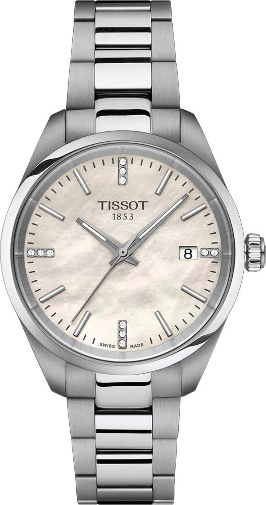 luxusné hodinky Tissot T-Classic PR 100 Diamanty, Quartz, Vode odolnosť 100M, 34 mm. Hodinky disponujú funkciami luminiscencia, ukazovateľ dátumu a E.O.L.. Základné parametre hodín sú: typ strojčeka je Quartz hodinky, materiál remienka je oceľ, vode odolnosť je 100 m a farba ciferníka je perleť.