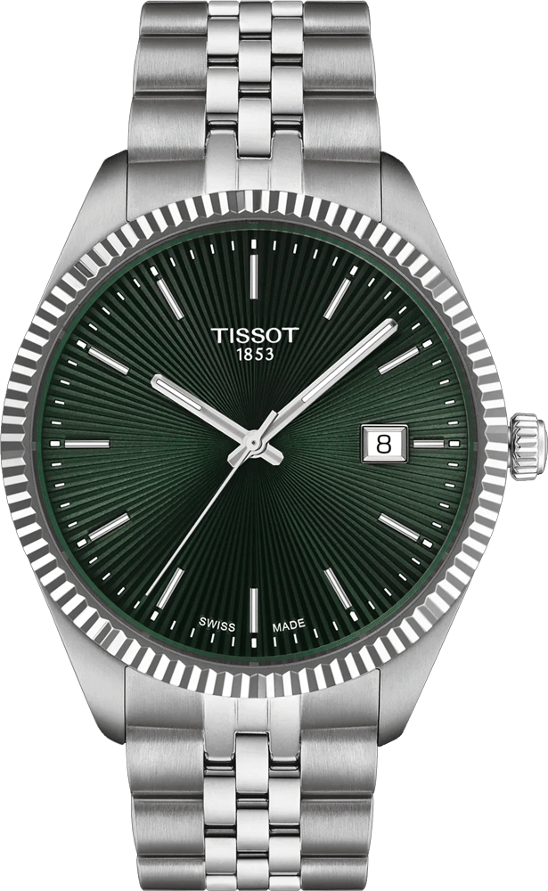 luxusné hodinky Tissot T-Classic Ballade Quartz, 40 mm. Hodinky disponujú funkciami luminiscencia, ukazovateľ dátumu a E.O.L.. Základné parametre hodín sú: farba ciferníka je zelená, typ strojčeka je Quartz hodinky, materiál remienka je oceľ a vode odolnosť je 100 m.