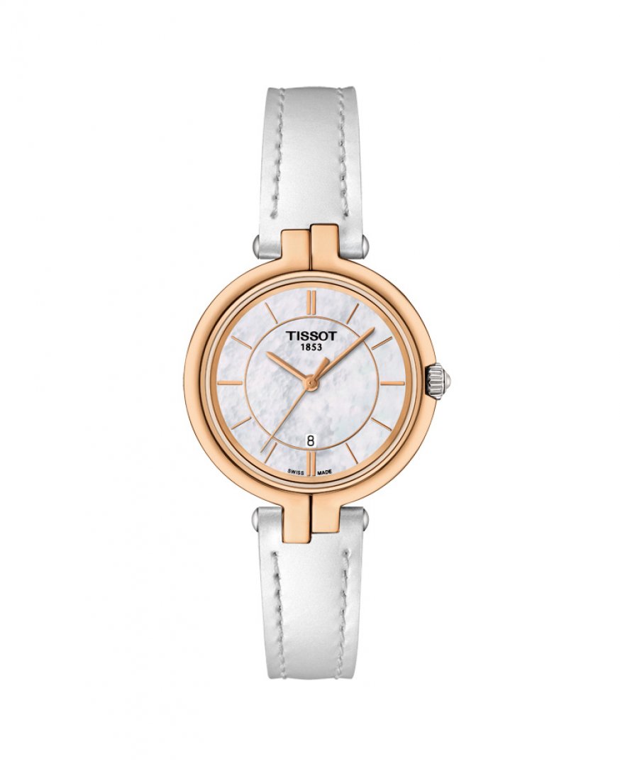 Módne hodinky Tissot T-Lady FLAMINGO, Quartz, 26 mm. Hodinky disponujú funkciami ukazovateľ dátumu. Základné parametre hodín sú: typ strojčeka je Quartz hodinky, vode odolnosť je 50 m, farba ciferníka je perleť a materiál remienka je koža.