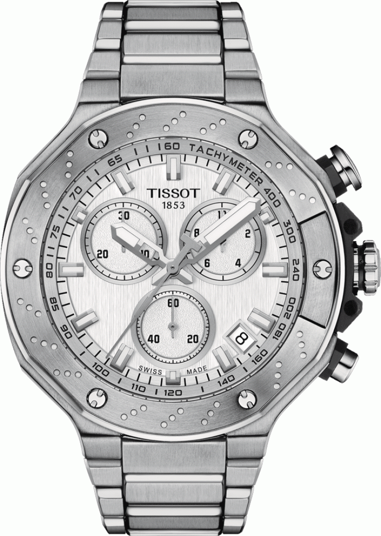 luxusné hodinky Tissot T-Race Quartz Chronograf, Vode odolnosť 100M, 45 mm. Hodinky disponujú funkciami luminiscencia, stopky, tachymeter, ukazovateľ dátumu a E.O.L.. Základné parametre hodín sú: typ strojčeka je Quartz chronograf, materiál remienka je oceľ, vode odolnosť je 100 m a farba ciferníka je strieborná.