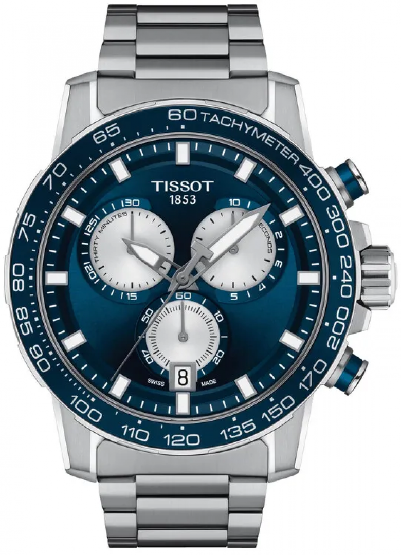 luxusné hodinky Tissot T-Sport Super Sport Chrono Quartz Chronograf, Vode odolnosť 100M, 45 mm. Hodinky disponujú funkciami luminiscencia, stopky, tachymeter a ukazovateľ dátumu. Základné parametre hodín sú: typ strojčeka je Quartz chronograf, vode odolnosť je 100 m, farba ciferníka je modrá a materiál remienka je oceľ.