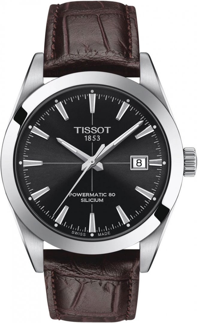 luxusné hodinky Tissot T-Sport GENTLEMAN SILICIUM Powermatic 80, Vode odolnosť 100M, 40 mm. Hodinky disponujú funkciami luminiscencia a ukazovateľ dátumu. Základné parametre hodín sú: typ strojčeka je mechanické hodinky s automatickým náťahom, materiál remienka je oceľ a koža, vode odolnosť je 100 m a farba ciferníka je čierna.