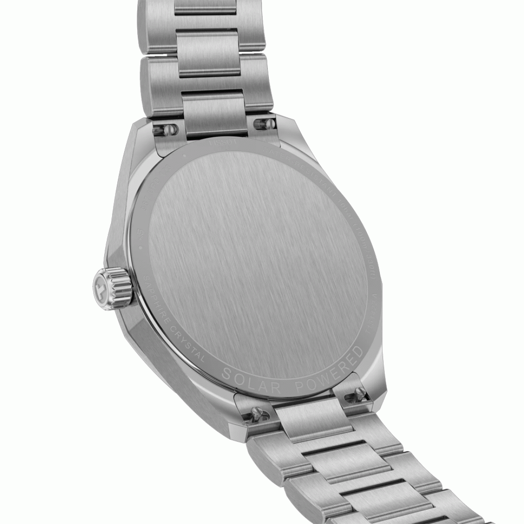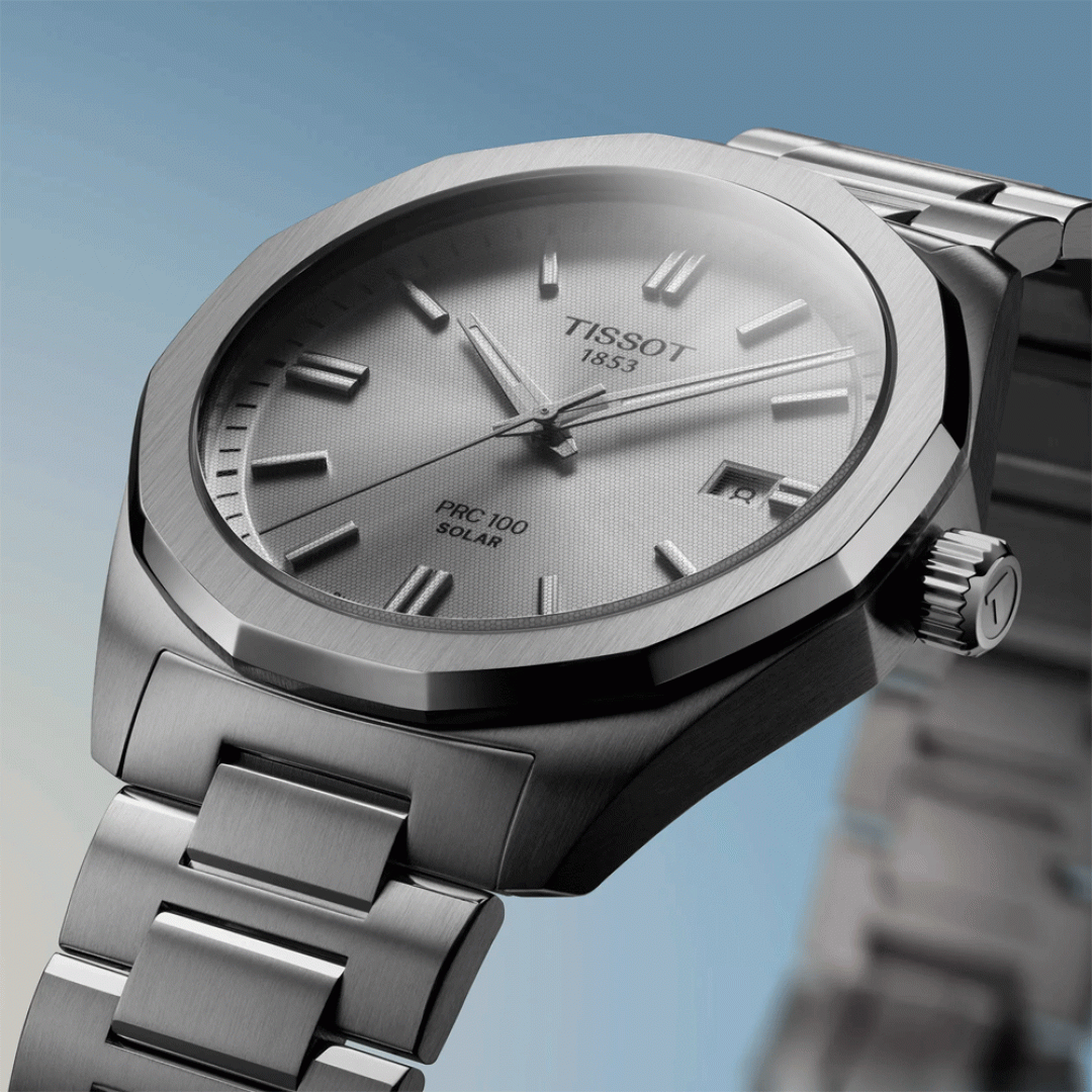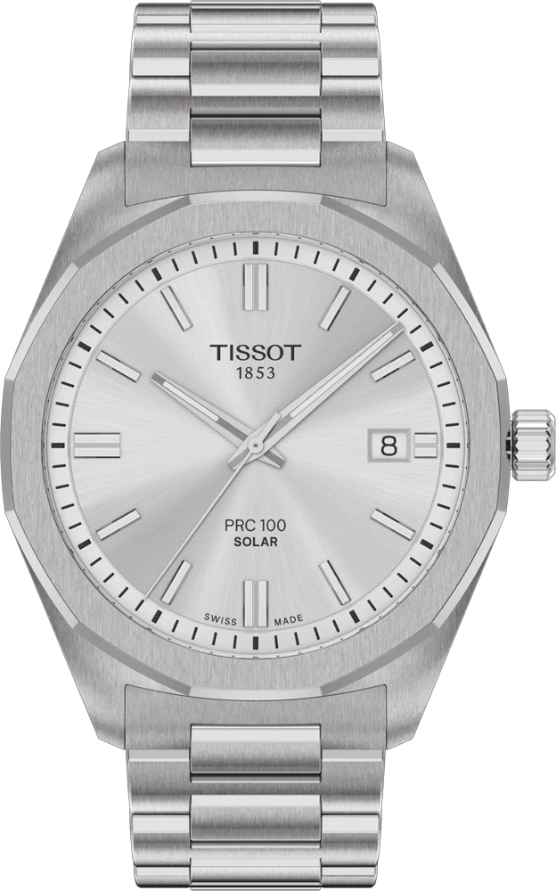 luxusné hodinky Tissot PRC 100 SOLAR Quartz, Vode odolnosť 100M, 39 mm. Hodinky disponujú funkciami luminiscencia a ukazovateľ dátumu. Základné parametre hodín sú: vode odolnosť je 100 m, materiál remienka je oceľ, farba ciferníka je strieborná a typ strojčeka je Quartz hodinky.