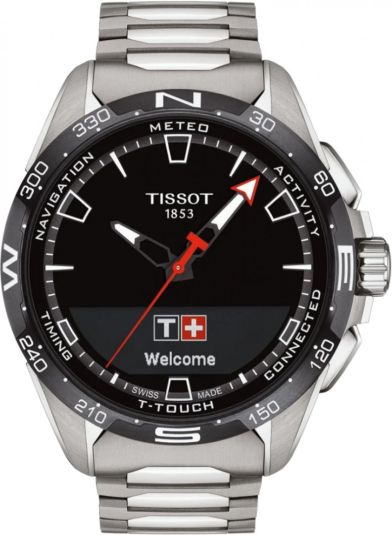 luxusné hodinky Tissot Touch Collection CONNECT SOLAR Bluetooth, Vode odolnosť 100M, 47.50 mm. Hodinky disponujú funkciami alarm, barometer, duálny čas, GPS, kalendár, kompas, luminiscencia, osvetlenie, odpočítavanie času, stopky, teplomer, tréningové funkcie, ukazovateľ dátumu, večný kalendár, výškomer, multifunkčné, GPS , Bluetooth® a Dotyková obrazovka. Základné parametre hodín sú: farba ciferníka je čierna, typ strojčeka je Quartz chronograf a špeciálne, vode odolnosť je 100 m a materiál remienka je titan.